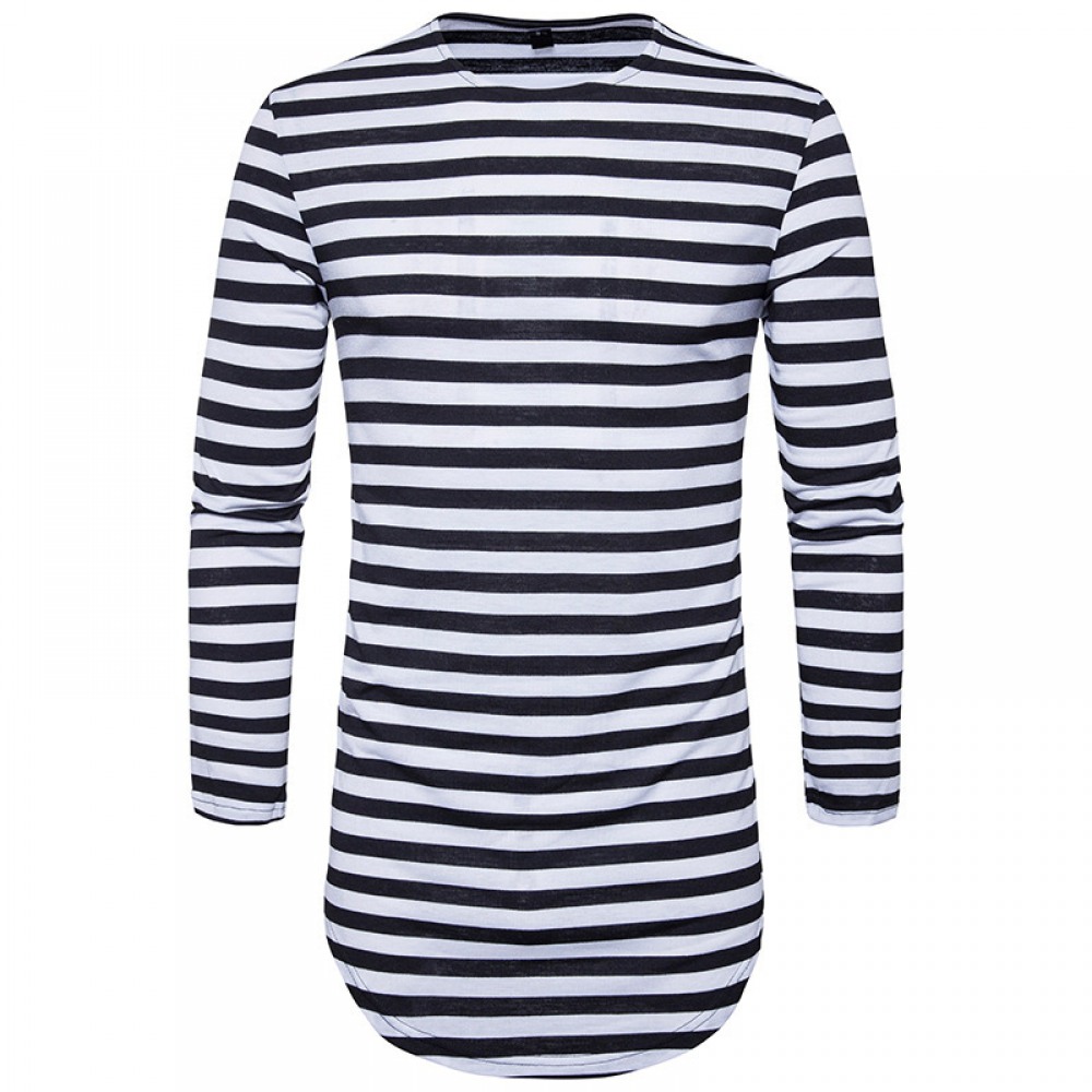Hip-Hop High Street Summer Men's Round Hem High Street Striped Long T-Shirt